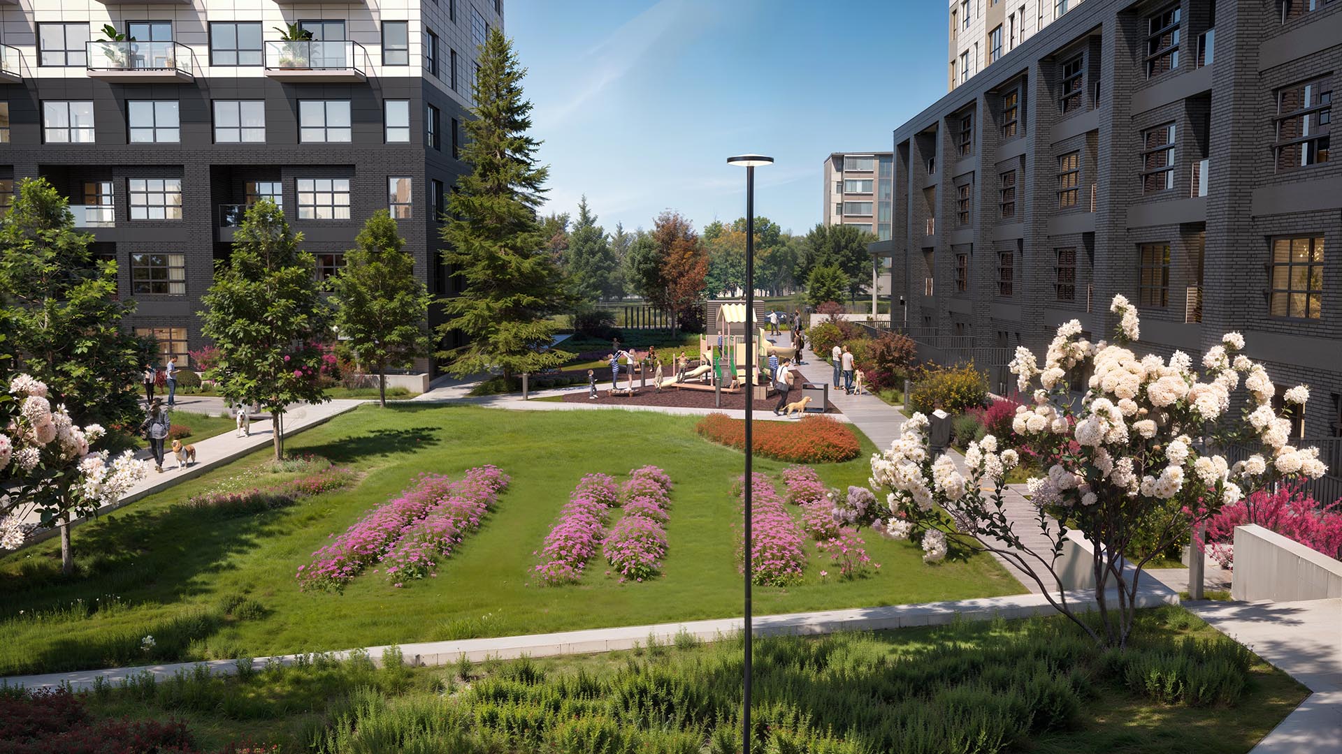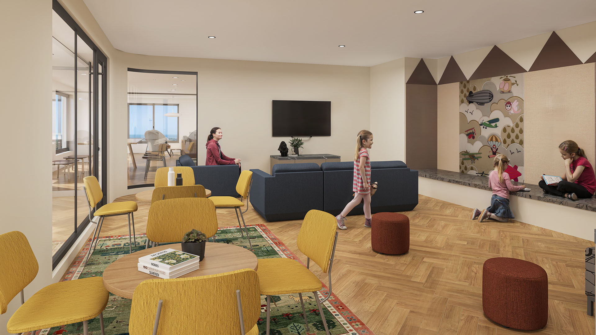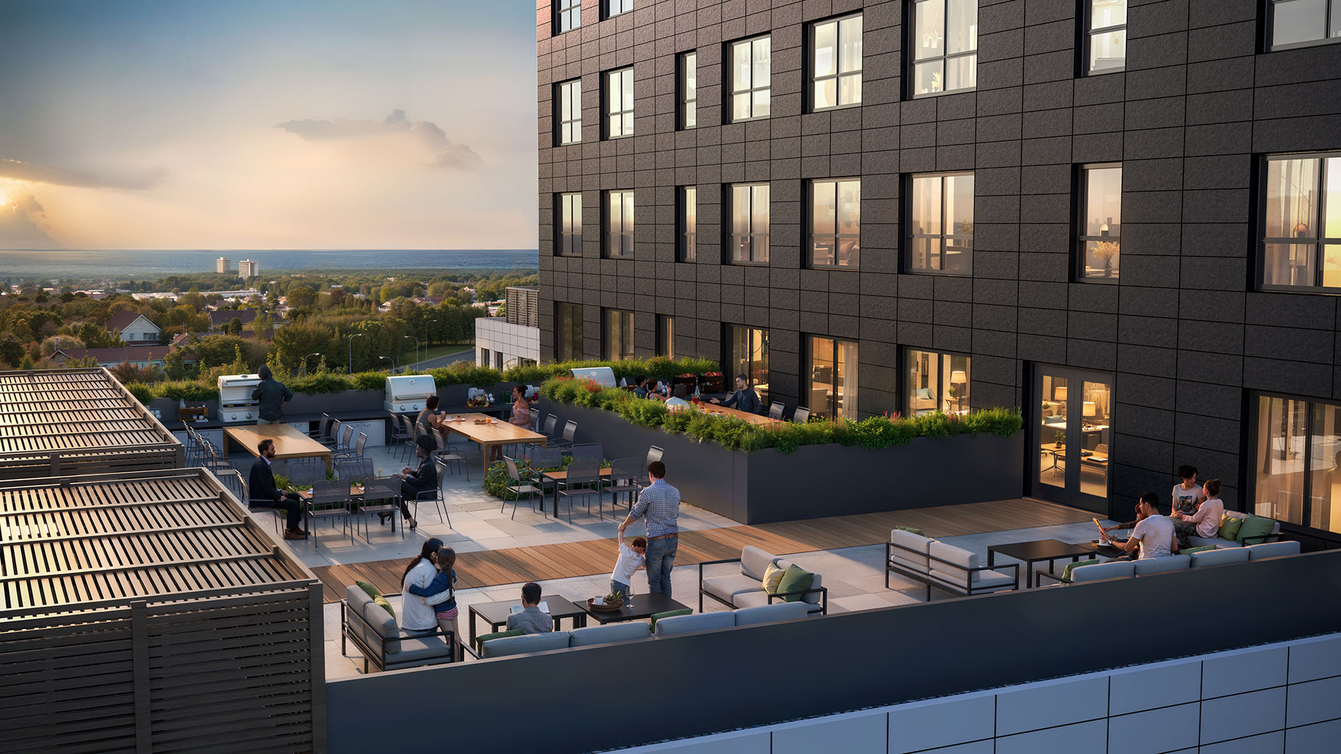 Over 27,000 square feet of amenity space, split between indoor programming and rooftop patios, has been curated to support wellness, productivity, and community connection. Residents will enjoy access to a modern fitness centre, yoga studio, social lounges, children's play areas, green rooftop zones, and BBQ stations. These shared spaces are designed to encourage a healthy, active lifestyle and foster neighbourly connection in a comfortable, welcoming environment.